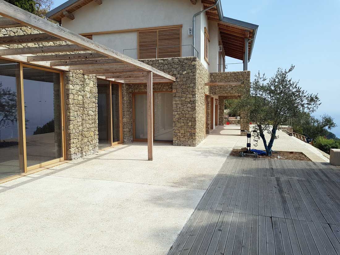 Siamo in grado di realizzare vialetti in cemento lavato e calce, muretti in pietra e recinzioni ecologiche, il deck in legno e i pergolati completano il quadro.